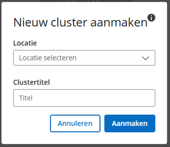 Zowel de locatie als de titel zijn verplichte velden. - Klik op 'Aanmaken' om het nieuwe cluster op te slaan.