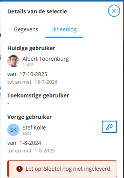 Als de vorige gebruiker de sleutel nog niet heeft ingeleverd is dit ook zichtbaar in het ‘Uitleenlog’.
